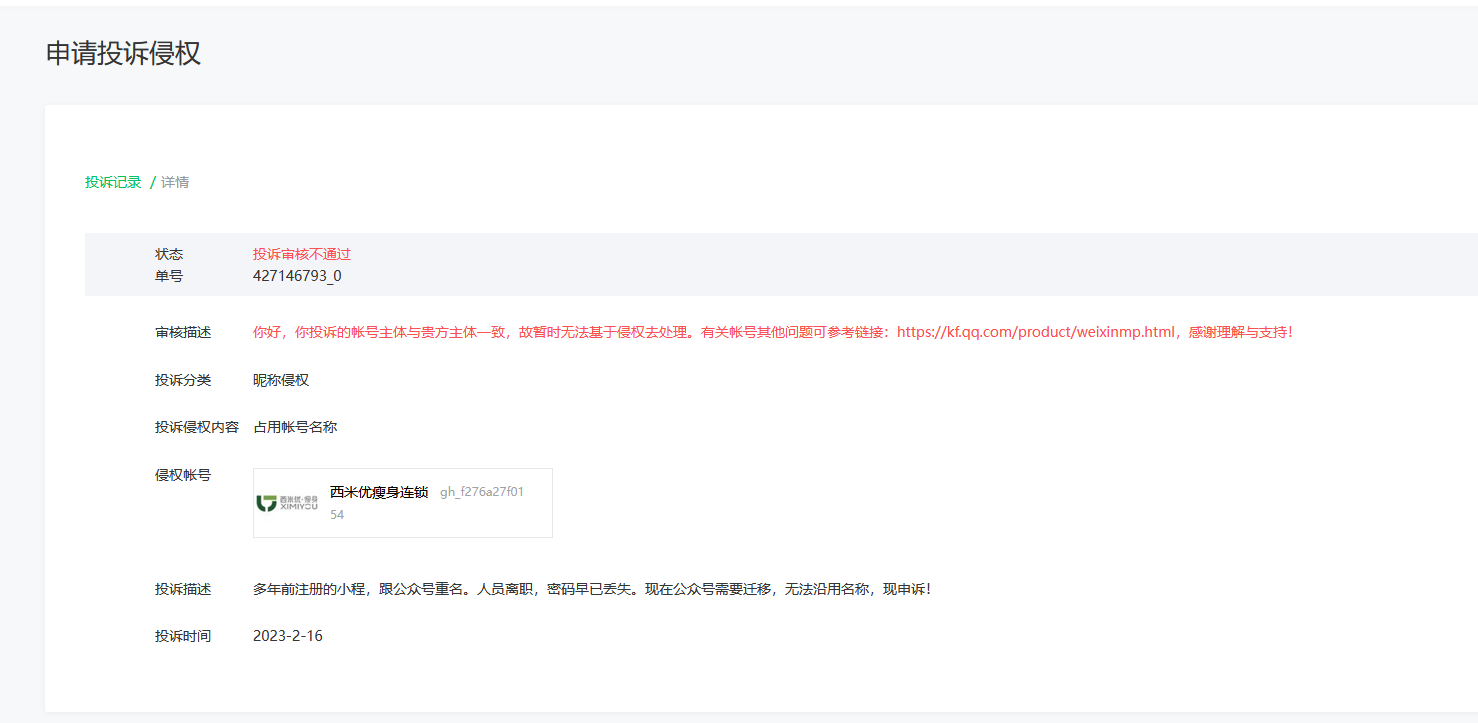 我就进行投诉 ,名称占用 ,结果失败了 ,提示我与小程序主体一致!