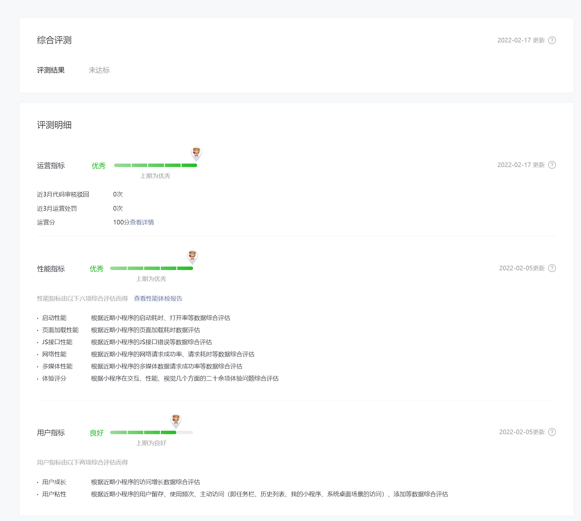 运营指标,性能指标是优秀,用户指标是良好,但是评测结果未达标,这怎么搞啊?appid:wxc93395d0a3c41c49