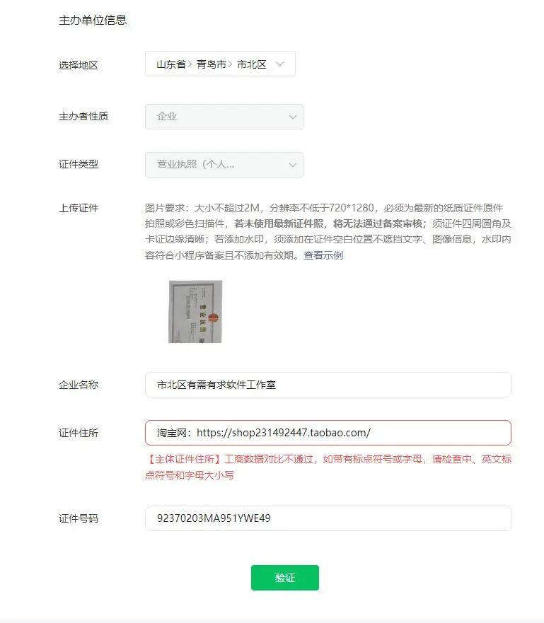 小程序备案的时候,提交后提示:【主体证件住所】工商数据对比不通过,如带有标点符号或字母,请检查中、英文标点符号和字母大小写