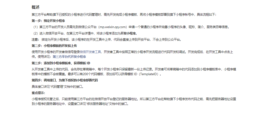 这里直接添加的小程序是用于进行模板开发的,绑定不是授权,只是让它作为第三方平台的开发小程序,它只能作为模板,对这个小程序开发后上传会上传到这里的草稿箱,然后可以将草稿转到模板库,就可以为授权给你们第三方的小程序进行上传代码等操作(代小程序实现业务)