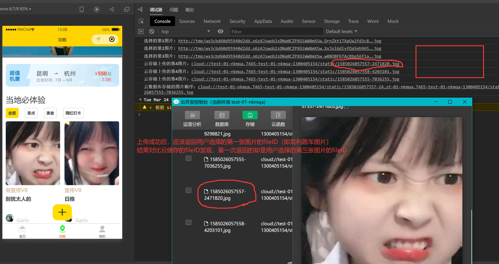 结果我到云储存一看,发现云储存返回的第一个fileID是那张女孩图片;可女孩的图片不是还没有上传吗?