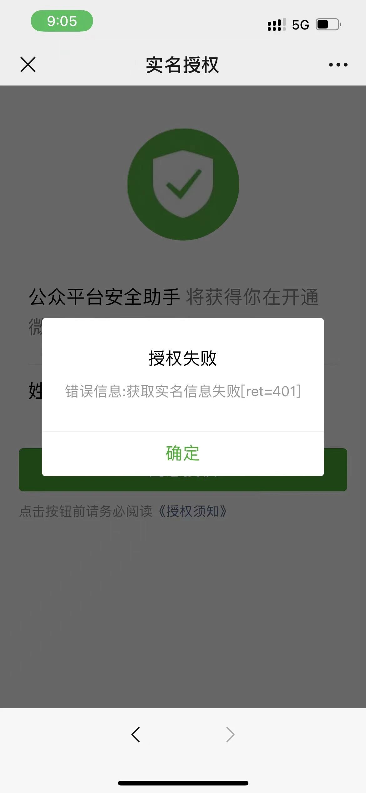 我们填写小程序管理员的时候,使用的是港澳居民居住证,并且扫码的微信绑定的实名认证也是这个港澳居民居住证,为什么扫码核验总弹出---错误信息:获取实名信息失败[ret=401]