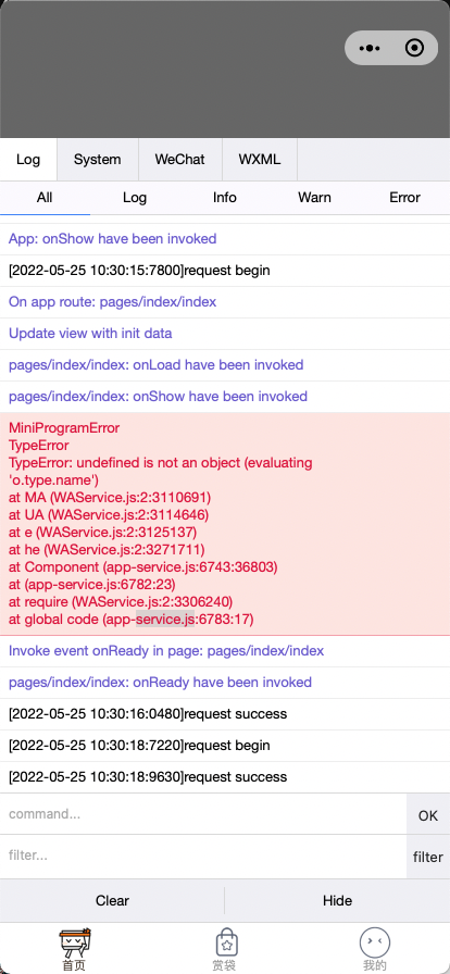 空白的手机打开调试后报错如图: