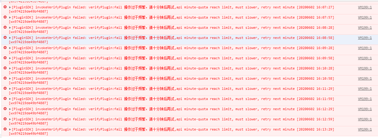 3、操作缓存“全部清除缓存”后,总报错VM199:1 [PluginSDK] invokeVerifyPlugin failed: verifyPlugin:fail 操作过于频繁,请十分钟后再试,api minute-quota reach limit, must slower, retry next minute [20200602 16:08:58][wx974219de49bf4807](如图二)