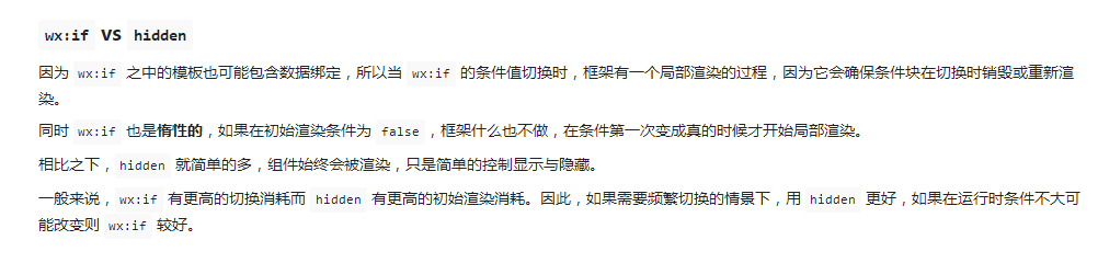 一般来说,wx:if 有更高的切换消耗而 hidden 有更高的初始渲染消耗。因此,如果需要频繁切换的情景下,用 hidden 更好,如果在运行时条件不大可能改变则 wx:if 较好。