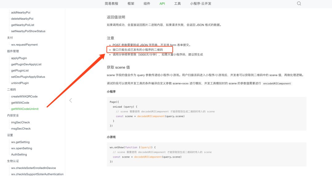 Page({ onLoad (query) { // scene 需要使用 decodeURIComponent 才能获取到生成二维码时传入的 scene const scene = decodeURIComponent(query.scene) } })