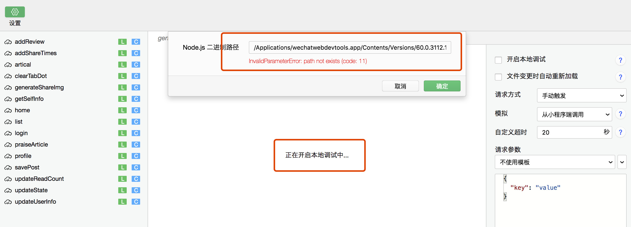另外,这个路径在新版工具中更新了,需要重新设置下,现在是在(中间的数字变了,因为内核升级了) /Applications/wechatwebdevtools.app/Contents/Versions/73.0.3683.103/wechatwebdevtools\ Helper.app/Contents/MacOS/node
