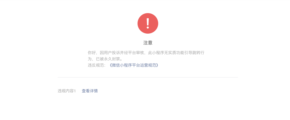 小程序被莫名封禁,理由是:因用户投诉并经平台审核,此小程序无实质功能引导跳转行为,已被永久封禁。