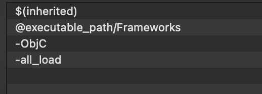 -ObjC -all_load 这两个加在 TARGETS 里的 Build Setting -> Linking -> Other Linker Flags.