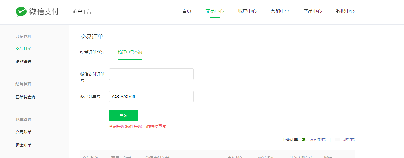 现象:输入订单号查询,提示:操作失败,请稍候重试。我过了一会儿再刷新一下,还是这样。