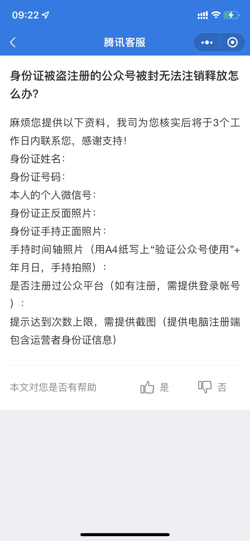 身份信息被盗用注册了公众号,该公众号已经被永久封禁,查询到了以下信息如何提交,或者哪位兄弟有更好的解决办法!