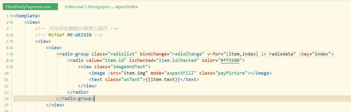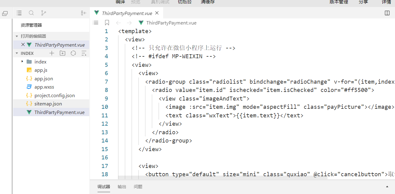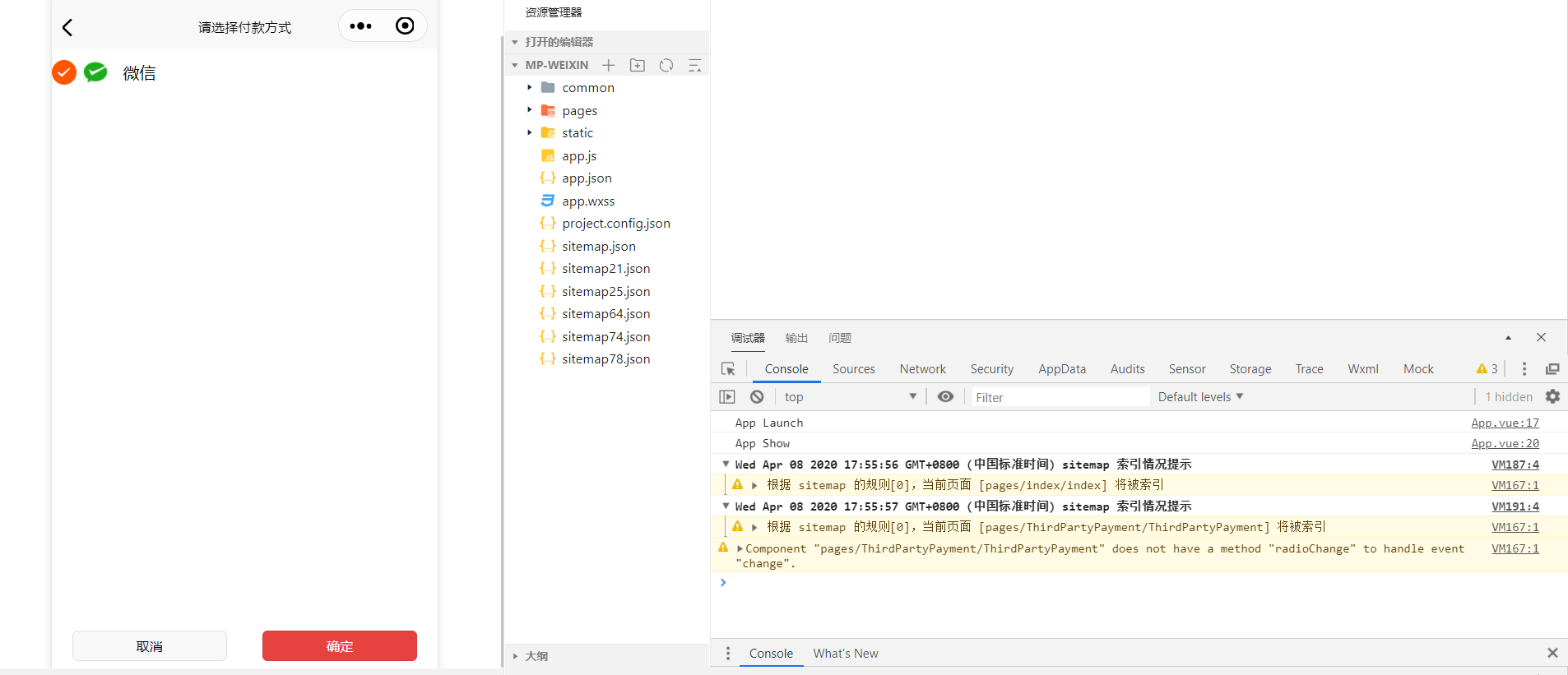 我给radio-group设置了监听 bindchange,对应的方法在methods里面也写了,然后在微信开发者工具上面点击radio-group的radio时,显示没有radioChange这个方法,这是为什么?