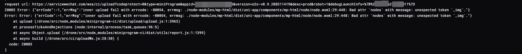 {"errCode":-1,"errMsg":"inner upload fail with errcode: -80054, errmsg: ./node-modules/mp-html/dist/uni-app/components/mp-html/node/node.wxml:29:448: Bad attr `nodes` with message: unexpected token `_img`."}