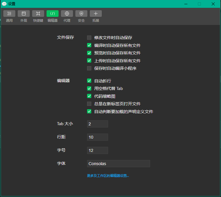 {微信开发者工具根目录}\code\package.nw\js\libs\vseditor\static\style.bundled.css 打开文件,搜索 .monaco-workbench .part>.content { 大约2551行左右 修改font-size为你想要的大小,比如18px,然后重新打开工具就能看到效果啦
