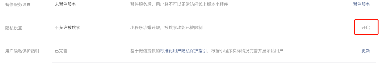 你好我的小程序已经整改完成,但现在搜索功能被限制了,请问怎么开启呢