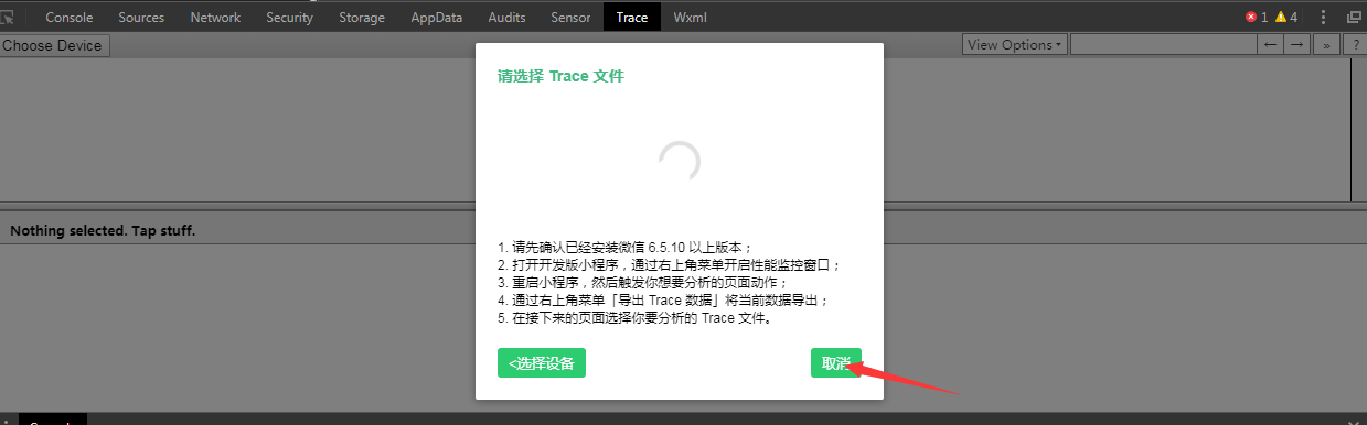 在开发者工具中,到出trace数据,手机端提示到出成功。但是请选择trace文件界面一致处于加载中,并且不显示trace文件,请问这是什么原因?