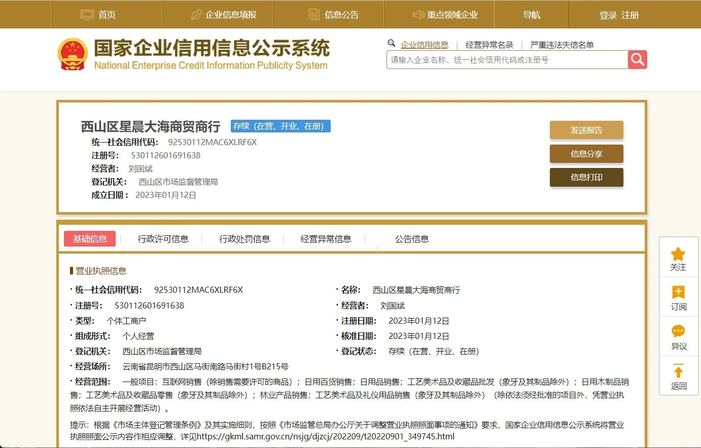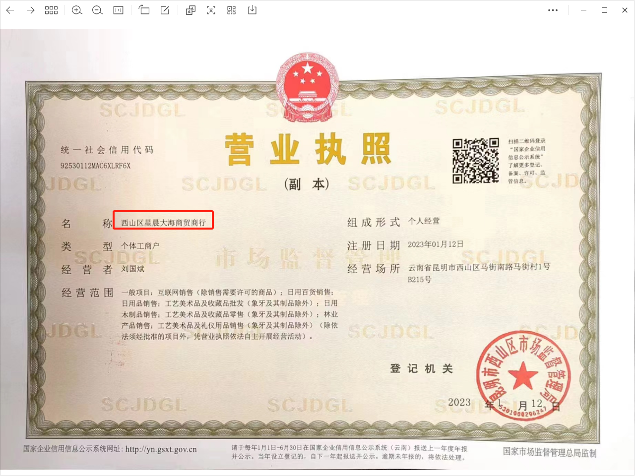 公司名称:西山区星晨大海商贸商行