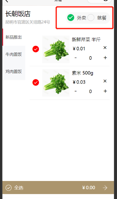 请问如图两个按钮(外卖点菜)(店内就餐),根据不同按钮跳转至图二页面,需求是框线内按钮选项根据上一步点击进行更改。