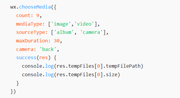 wx.chooseMedia({ count: 9, mediaType: ['image','video'], sourceType: ['album', 'camera'], maxDuration: 30, camera: 'back', success(res) { console.log(res.tempFiles[0].tempFilePath) console.log(res.tempFiles[0].size) } })