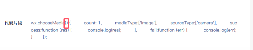 注意看官方的写法,不是 wx.chooseMedia(){...} 而是wx.chooseMedia({ ... })