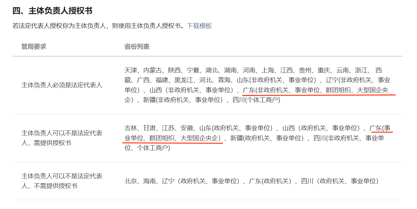 你好,广东地区主体负责人支持授权的主体类型不包含宗教团体,广东(非政府机关、事业单位、群团组织、大型国企央企)主体负责人必须是法定代表人;