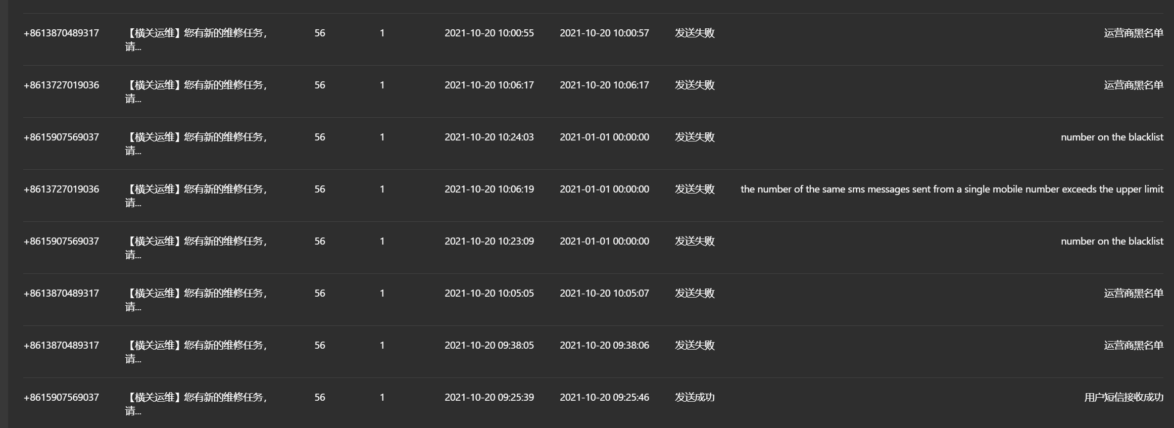 测试了3个手机号,其中两个手机号“显示运营商黑名单”,一个号正常,正常的号回复退订以后再次发送显示“number on the blacklist”。有打电话问过10086说他们查不到屏蔽信息