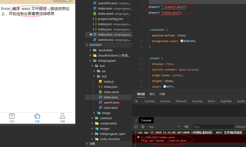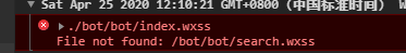 Sat Apr 25 2020 15:24:00 GMT+0800 (中国标准时间) WXSS 文件编译错误VM55:1 ./bot/bot/index.wxssFile not found: ./search.wxss代码片段还不懂。