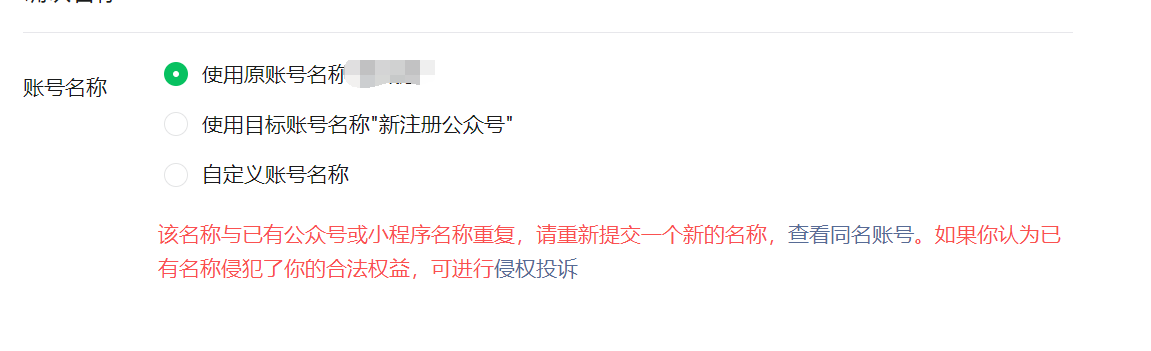 我的同主体下有一个同名字的公众号和小程序,近期迁移公众号到一个新的主体,使用原名称的时候提示,平台已经有相同的名字的小程序和公众号了。导致我无法使用。