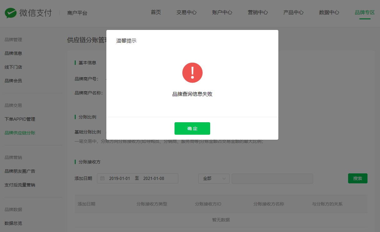品牌专区->供应链分账无法进入,报品牌查询信息失败错误。出现问题品牌ID:1975