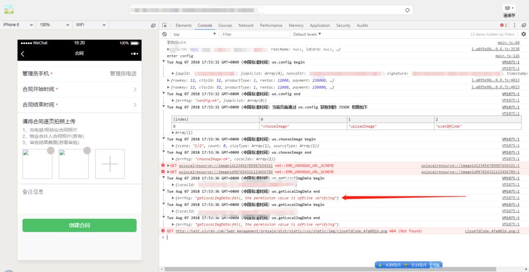 通过微信开发者工具运行代码,选择iPhone 6机型,点击以后会出现报错,{errMsg: "getLocalImgData:fail, the permission value is offline verifying"},但是查看权限配置目录,并没有显示需要在wx.config()里注入getLocalImgData。