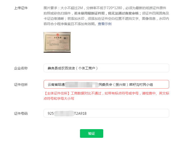 小程序备案:提示。备案无法提交以及修改:【主体证件住所】工商数据对比不通过,如带有标点符号或字母,请检查中、英文标点符号和字母大小写,营业执照有重新拍过,信息也有检查过还是一样提示,无法继续下一步
