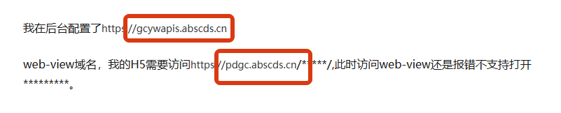 web-view域名,我的H5需要访问https://pdgc.abscds.cn/*****/,此时访问web-view还是报错不支持打开*********。