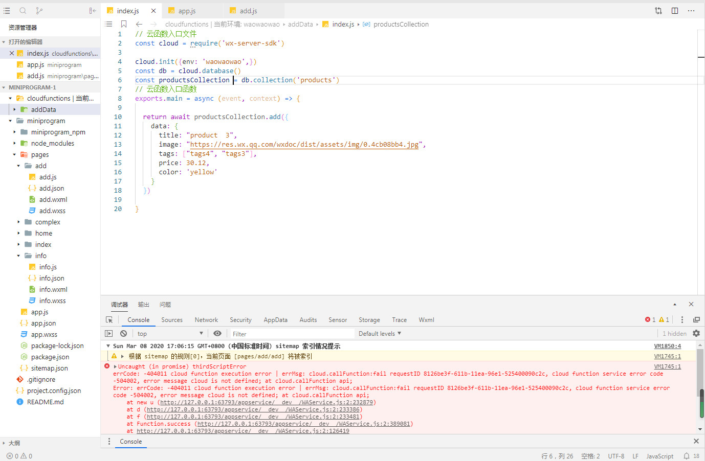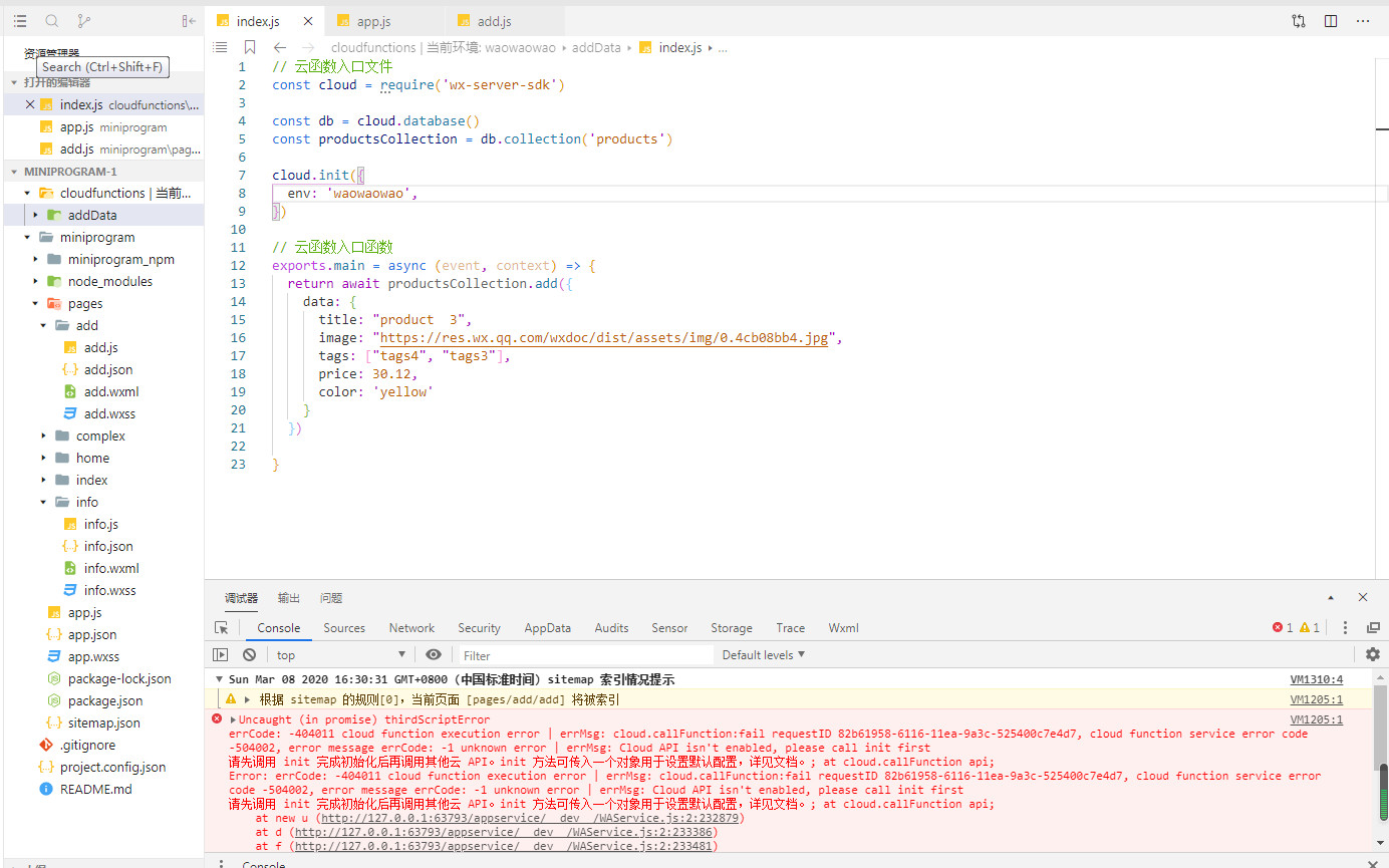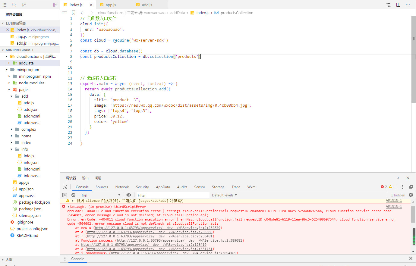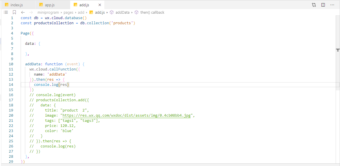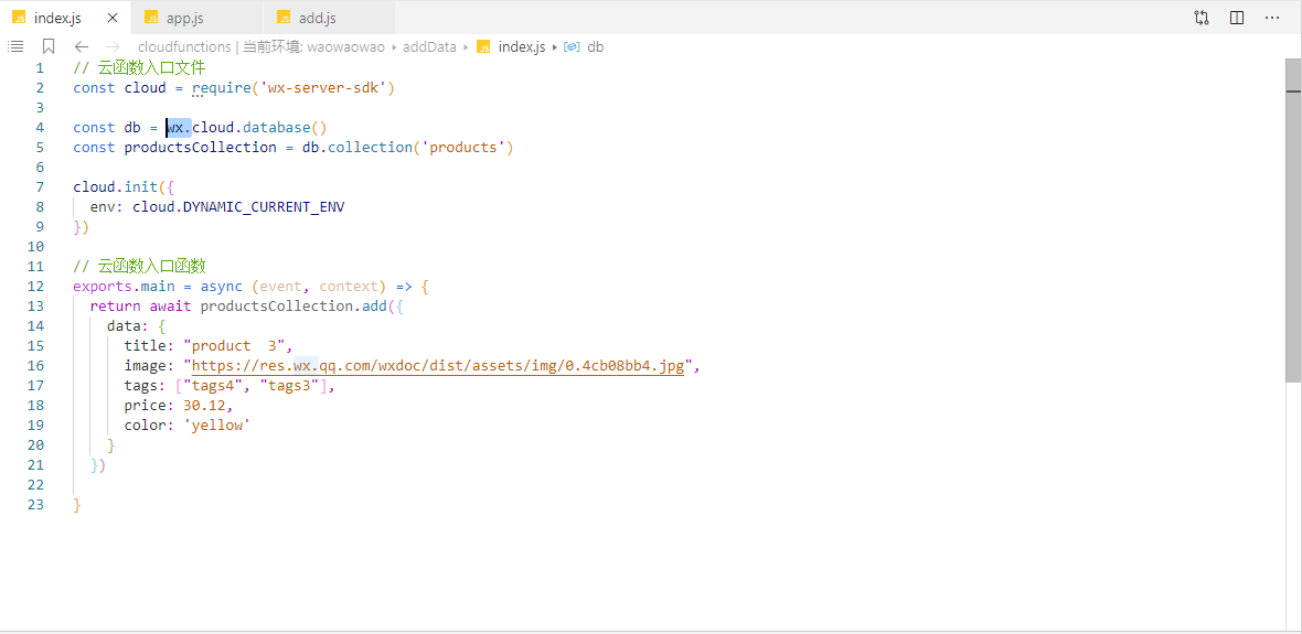 // 云函数入口文件const cloud = require('wx-server-sdk')cloud.init({env: 'waowaowao',})const db = cloud.database()const productsCollection = db.collection('products')// 云函数入口函数exports.main = async (event, context) => {return await productsCollection.add({data: {title: "product 3",image: "https://res.wx.qq.com/wxdoc/dist/assets/img/0.4cb08bb4.jpg",tags: ["tags4", "tags3"],price: 30.12,color: 'yellow'}})}
