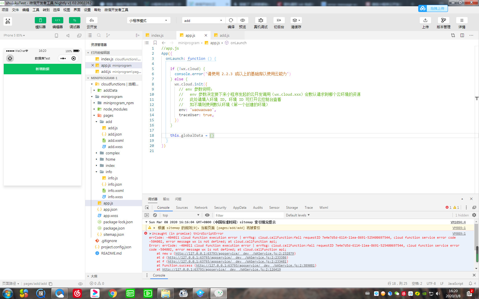 按照腾讯课堂“小程序·云开发 — 数据库项目实战-新增一条数据”,一步一步做的。老师的成功了,但是我这却一直报错。。。