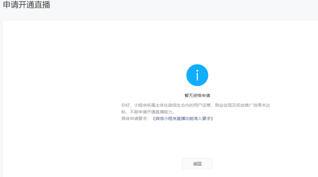我们这个公众号粉丝是满足100以上了,之前公众号与小程序 不是同一个主体的,现在已绑定与小程序同一主体的公众号并且满足累计粉丝大于100的要求,时间也过了有两天左右了,前后一个星期左右了,一直都开通不了,还是一直提示;你好,小程序所属主体在微信生态内的用户运营、商业变现及投放推广效果未达标,不能申请开通直播能力。