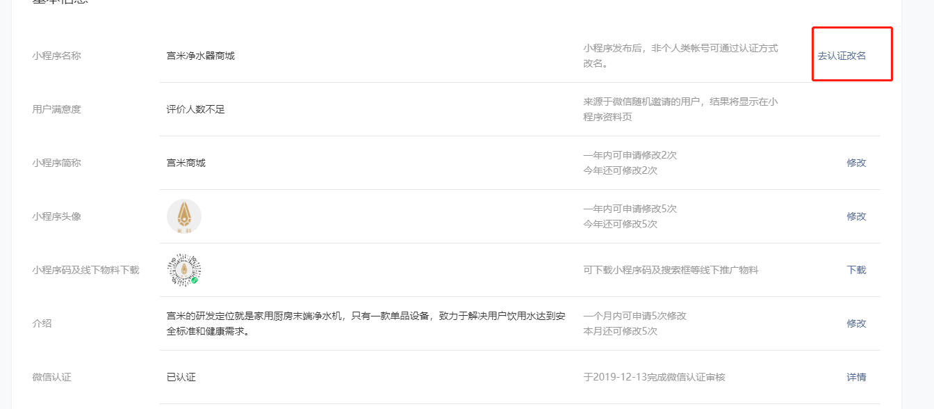 入口二:小程序账号后台:设置->基本信息->微信认证->去认证;