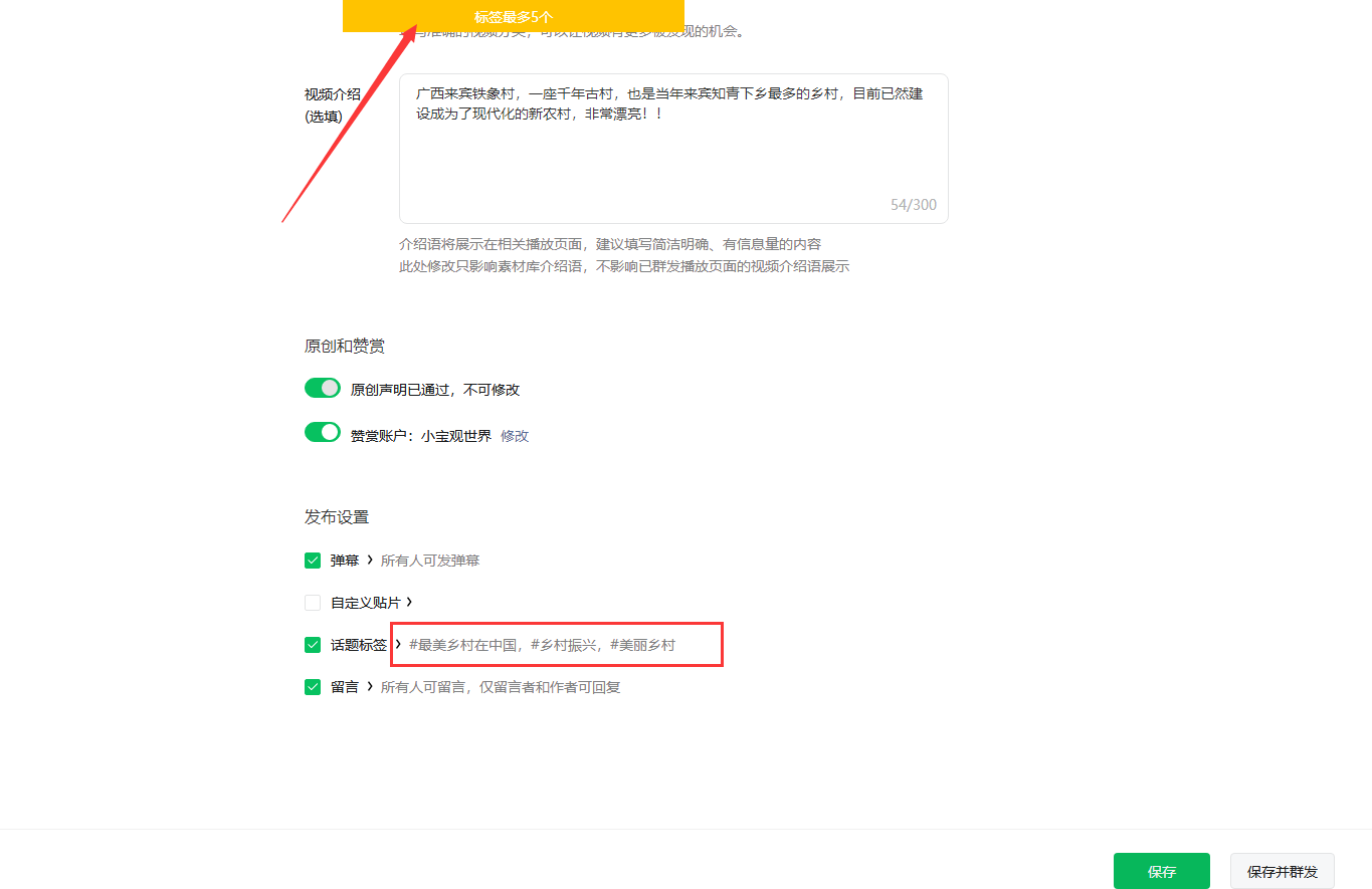 微信公众号素材库中,视频素材重新编辑素材后无法保存,提示最多5个标签,但实际上我只写了三个标签,我把所有标签去掉,以及不勾选标签,同样还是提示:标签最多5个,无法保存,到底怎么回事,请尽快帮忙看下!!