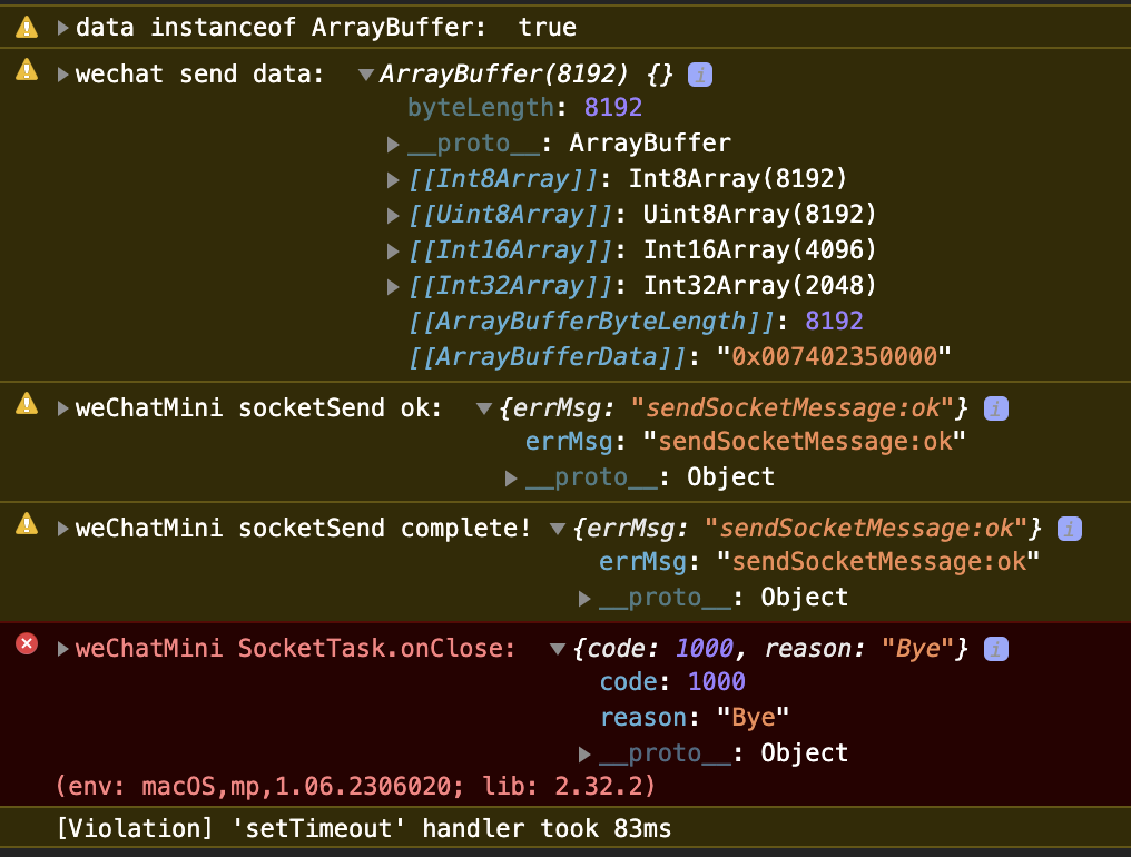 在SocketTask.send发送Arraybuffer后,success事件触发,complete事件触发并且返回{errMsg: "sendSocketMessage:ok"}
