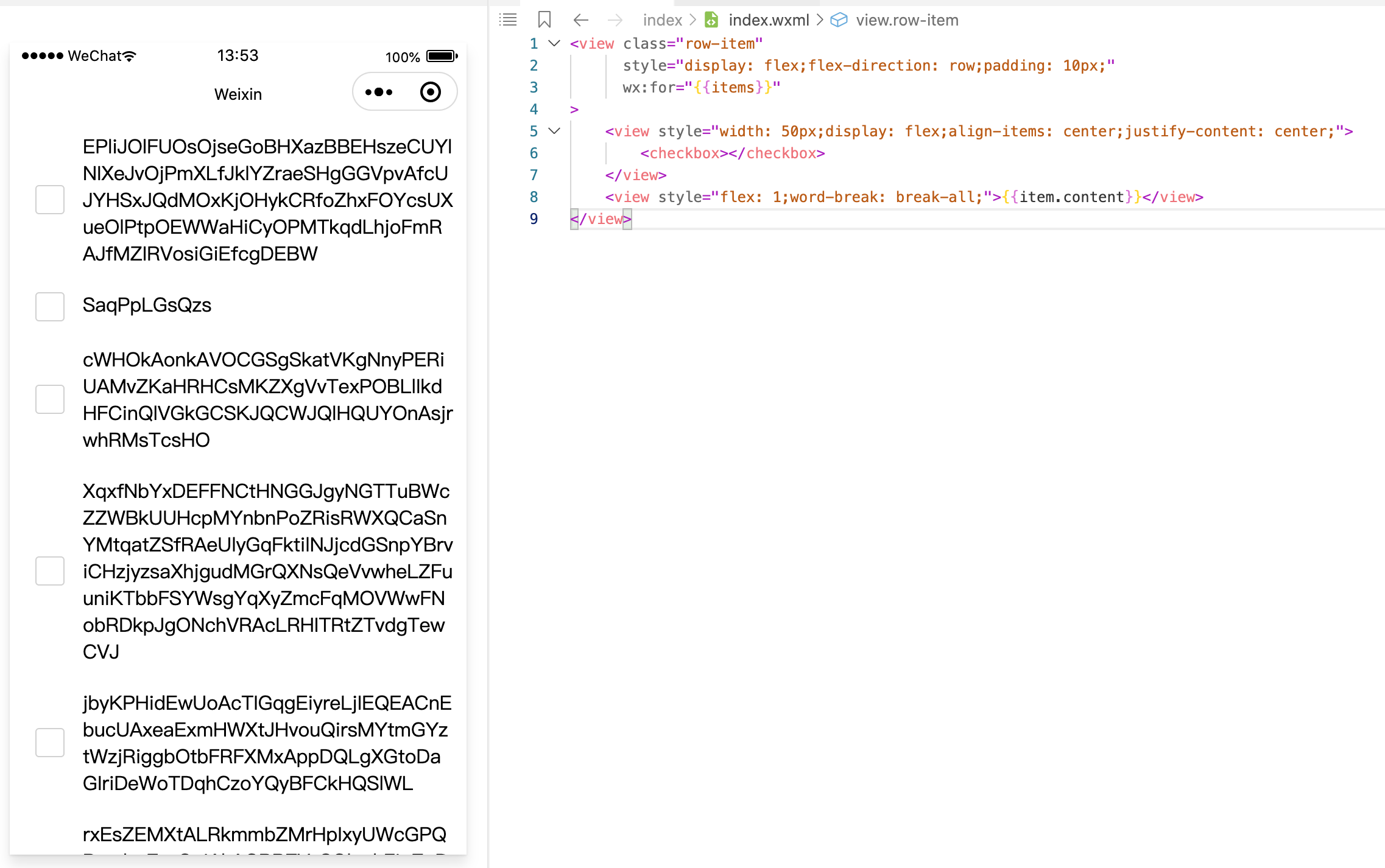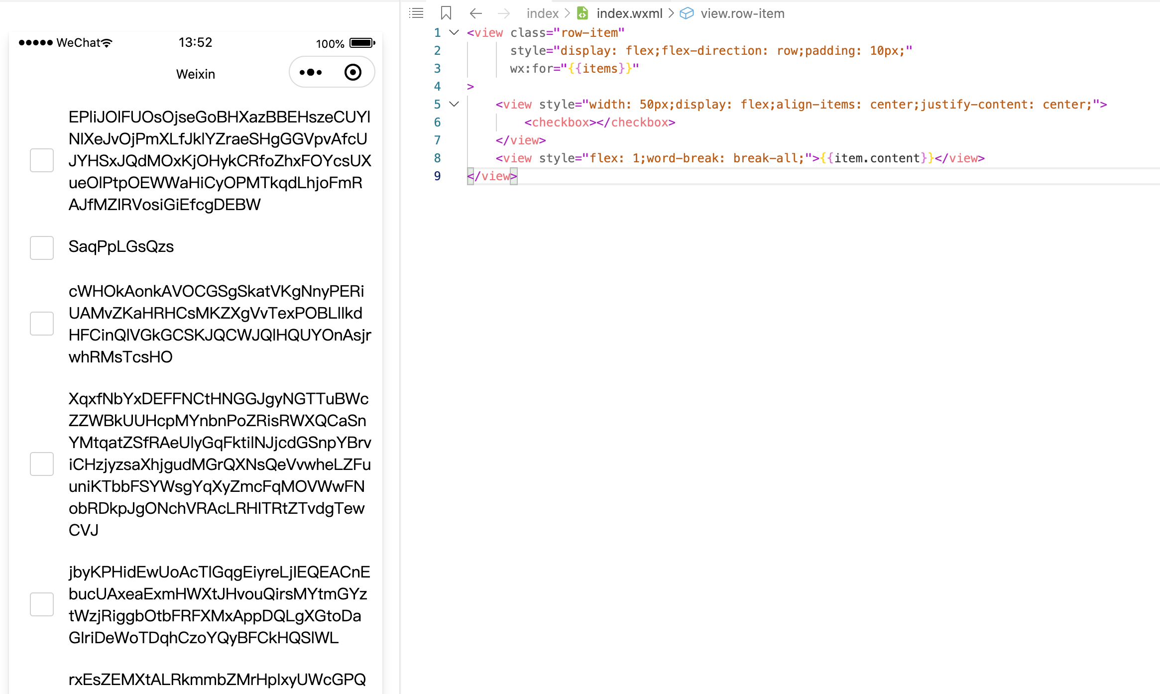 <view class="row-item"style="display: flex;flex-direction: row;padding: 10px;"wx:for="{{items}}"><view style="width: 50px;display: flex;align-items: center;justify-content: center;"><checkbox></checkbox></view><view style="flex: 1;word-break: break-all;">{{item.content}}</view></view></view>