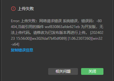 { "plugins": { "wmpf-voip": { "version": "dev-921a8b2691ed173478641355f335b52b", "provider": "wxf830863afde621eb" } } } 这个插件版本无法提交小程序代码,请问该如何解决