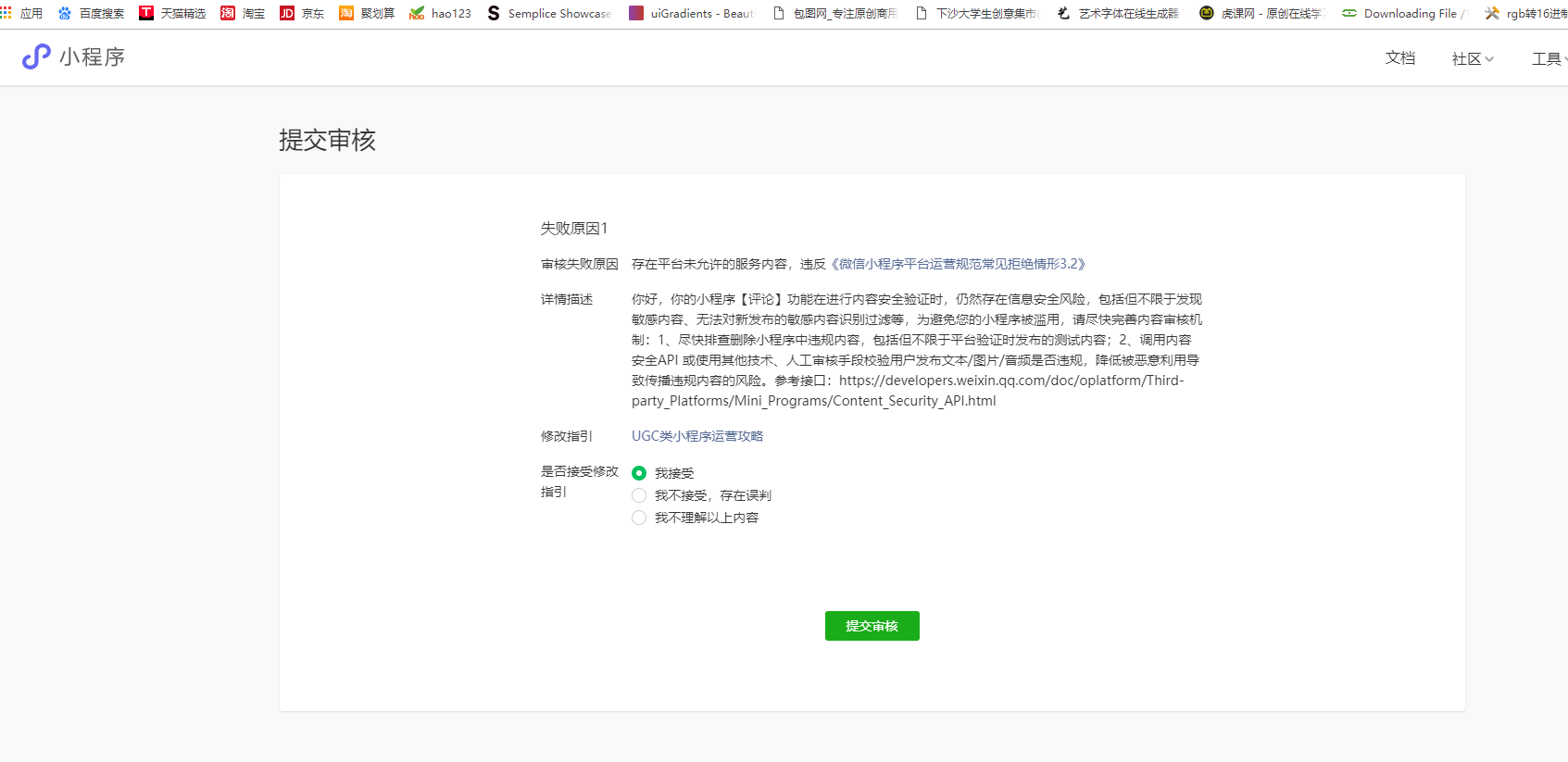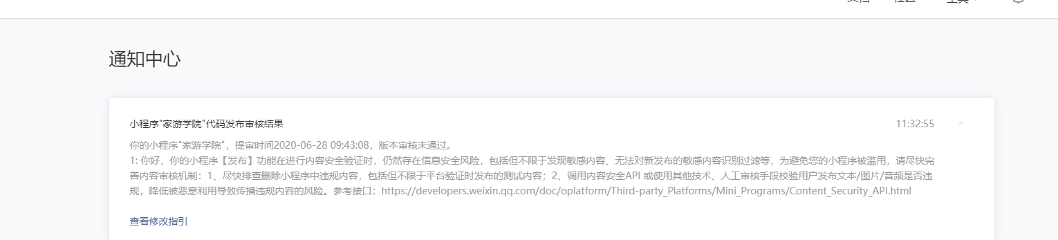 你的小程序【评论】功能在进行内容安全验证时,仍然存在信息安全风险,包括但不限于发现敏感内容、无法对新发布的敏感内容识别过滤等,为避免您的小程序被滥用,请尽快完善内容审核机制:1、尽快排查删除小程序中违规内容,包括但不限于平台验证时发布的测试内容;2、调用内容安全API 或使用其他技术、人工审核手段校验用户发布文本/图片/音频是否违规,降低被恶意利用导致传播违规内容的风险。参考接口:https://developers.weixin.qq.com/doc/oplatform/Third-party_Platforms/Mini_Programs/Content_Security_API.html