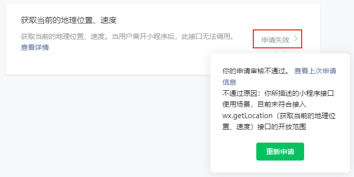 申请获取当前地理位置刚开始是审核失败,再提交之后就是审核失效,而不是审核失败了,这是怎么回事啊?不通过的原因一直没变过,是不是就没到后台啊?试了好多次了,都是不行