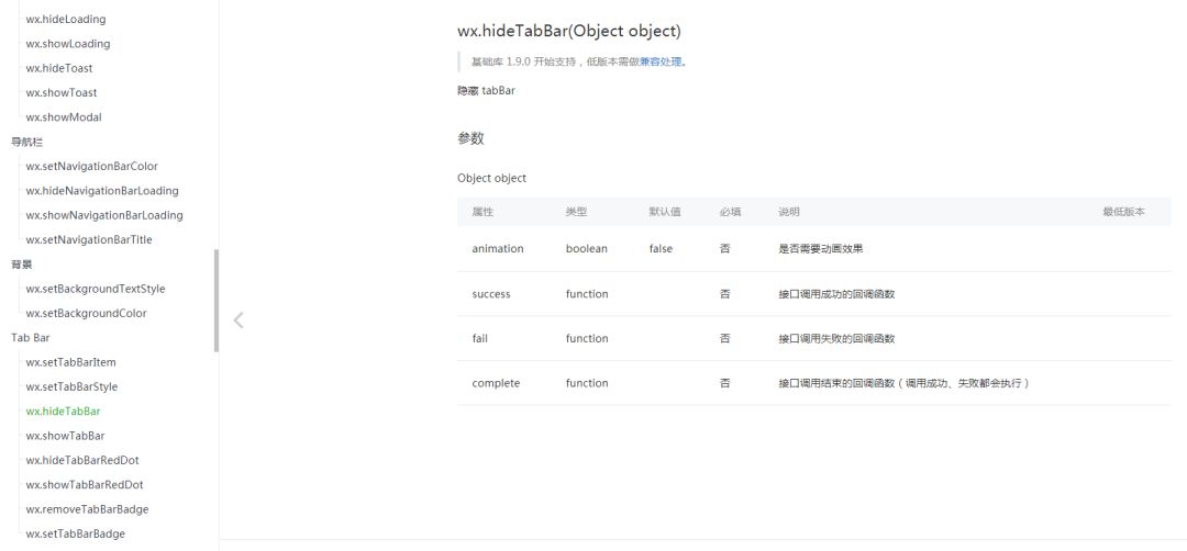 https://developers.weixin.qq.com/miniprogram/dev/api/wx.hideTabBar.html