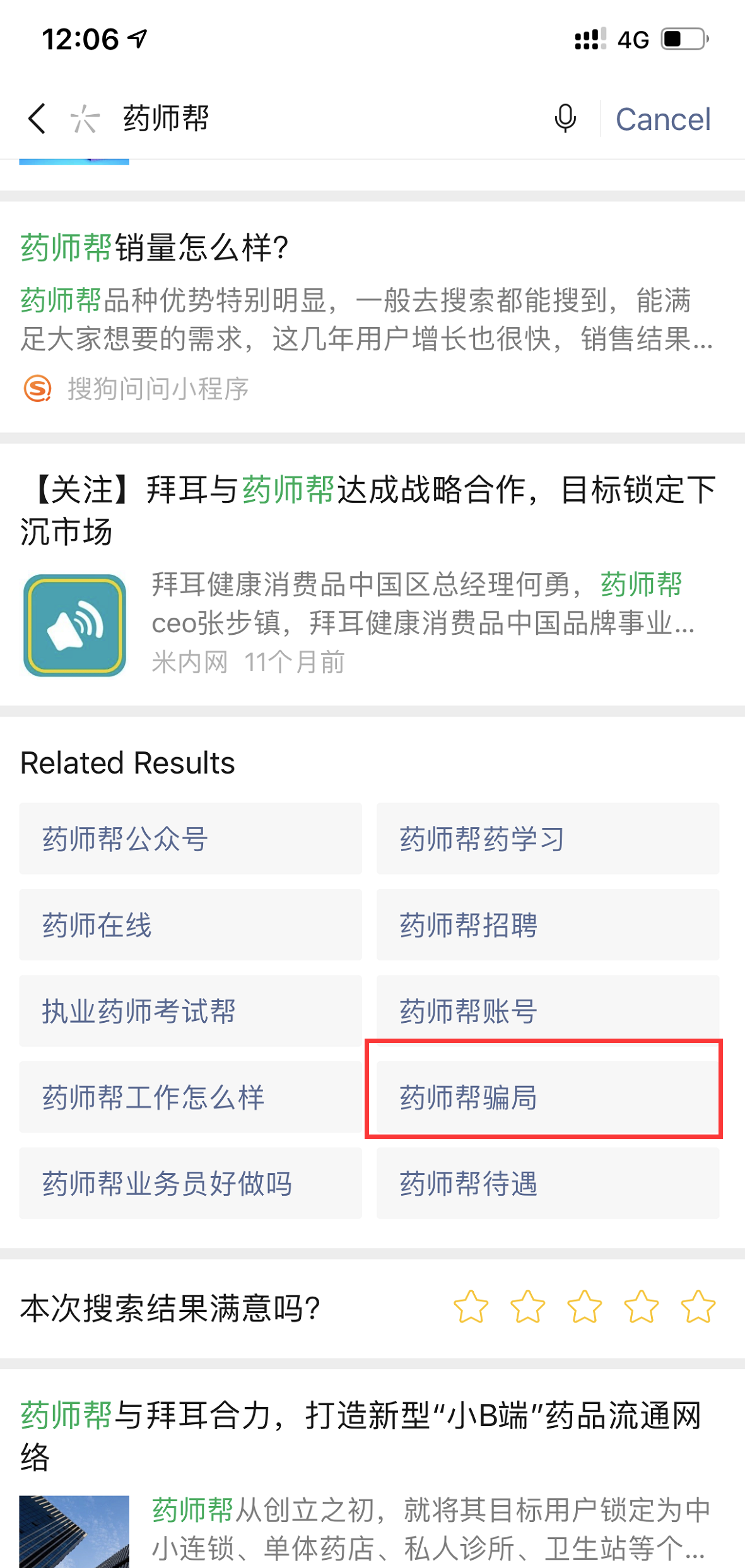 在搜一搜里搜索“药师帮”时出现:“药师帮骗局”,实际上点进去出现的内容并无真实凭据,纯属恶意诋毁和蹭热度,望处理!