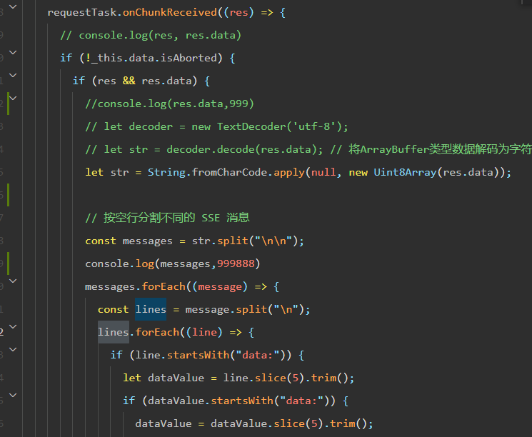 应该像智能回答的,在前端,确保正确地拼接接收到的所有数据块。可以在接收到每个数据块时,将其追加到一个缓冲区,并在请求完成后再进行统一处理