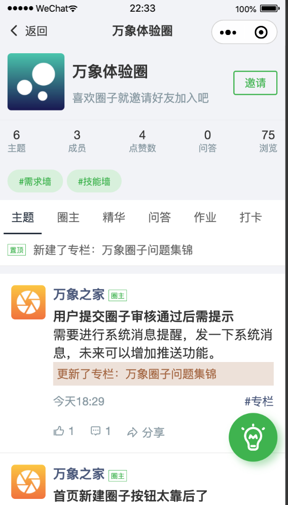 我们打开一个圈子,可以看看圈子内部都有什么样的内容:类似朋友圈,但是比朋友圈的功能多了很多,当前展示的是圈子专栏类目,实际上还可以发布圈子通知、圈子投票、圈子打卡等多种内容,而且在展示也是和专栏类似的。