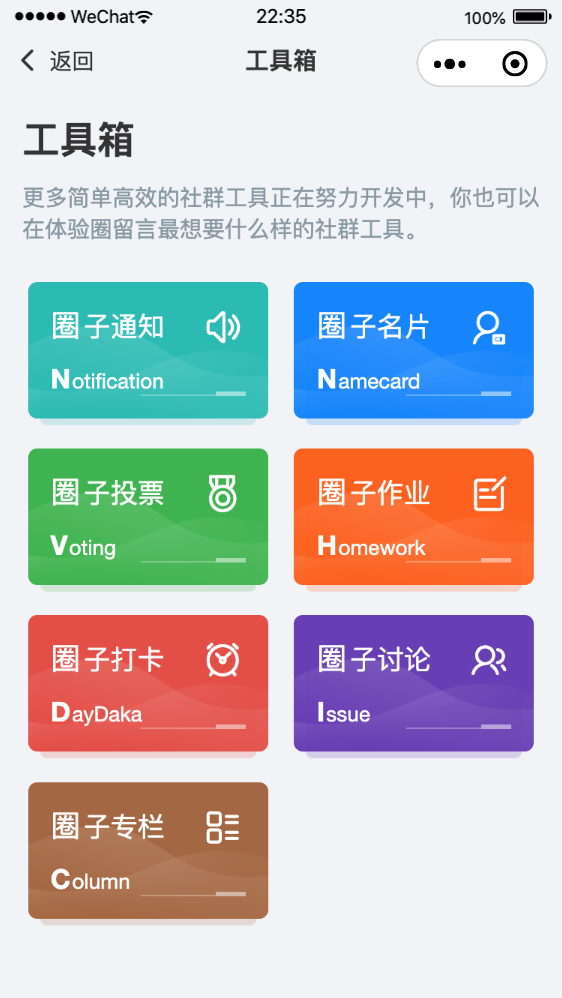 当前这款产品还是有许多需要优化的地方,后期我们会继续改进,最后让大家看一下圈子工具箱。这个可以说是完全辅助于圈子的,圈主想要什么,我们就开发什么。圈主才是第一位的。