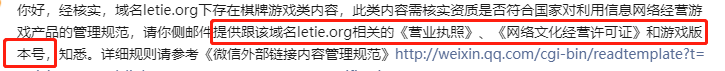 你好,经核实,域名letie.org下存在棋牌游戏类内容,此类内容需核实资质是否符合国家对利用信息网络经营游戏产品的管理规范,请你侧邮件提供跟该域名letie.org相关的《营业执照》、《网络文化经营许可证》和游戏版本号,知悉。详细规则请参考《微信外部链接内容管理规范》http://weixin.qq.com/cgi-bin/readtemplate?t=weixin_external_links_content_management_specification