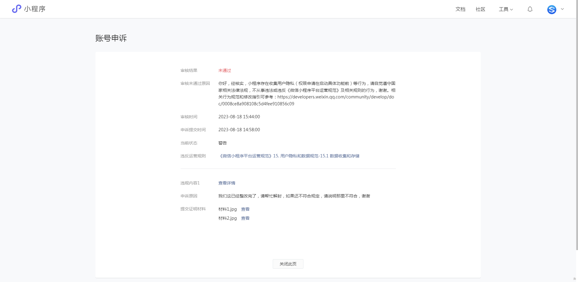 感谢反馈,申诉结果已通过站内信下发,可在mp后台登录查看详情根据站内信指引完成整改后重新发起申诉即可。