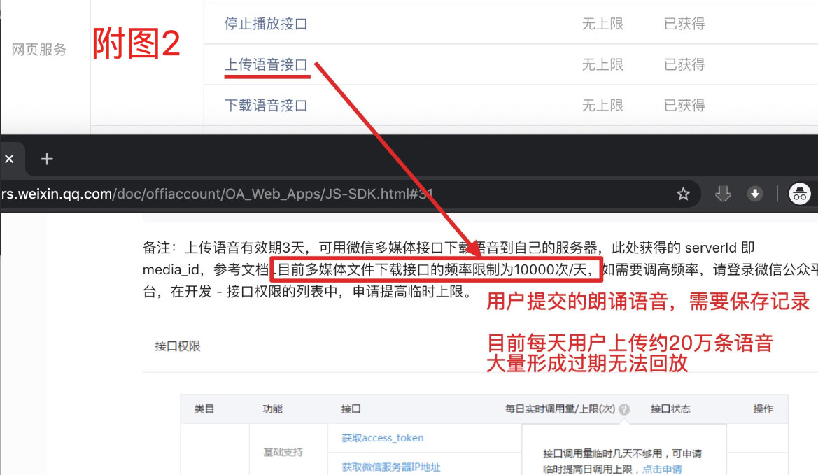 3)目前发现,语音接口每天下载限频1万(见附图2),我们无法备份语音到我方服务器,导致大量的语音播放失效;